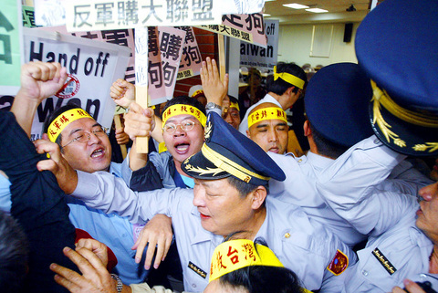 While the committee was convening yesterday, dozens of people from the Anti-Arms Purchasing Alliance led by independent Legislator May Chin (高金素梅) staged a protest, shouting "oppose arms purchase."