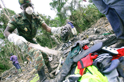 Rescuers made their way through the mud and gnarled pieces of metal, collecting remnants of clothes and bodies that were then transported to the town of Mbanga-Pongo, an hour's walk away, for identification.
