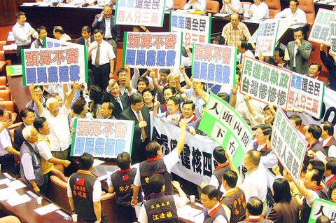 Pan-blue lawmakers held up signs blasting Chang for his decision to suspend the project.