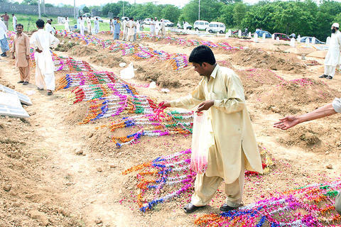 The remains of dozens of militants were lowered into temporary graves in Islamabad early yesterday.