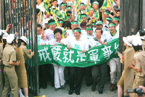 They then recreated a sit-in that Chen, Hsieh, Chang and other democracy activists had staged inside the temple on May 19, 1986, to demand the lifting of martial law. A group of DPP staffers were dressed in police uniforms, acting as riot cops from the martial law period to stop the protesters.