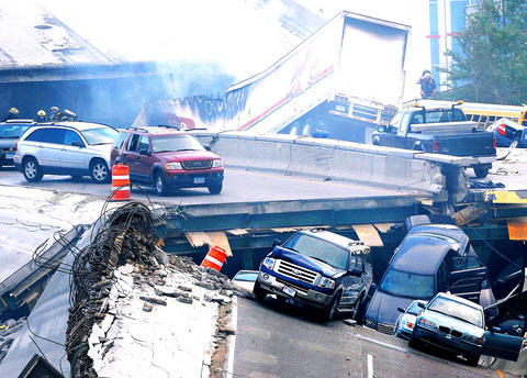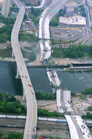 The eight-lane Interstate 35W bridge, which is a major Minneapolis artery, was being repaired and two lanes in each direction were closed when the bridge buckled on Wednesday evening, breaking into huge sections and collapsing into the river, pitching dozens of cars 18m into the water and killing at least seven.