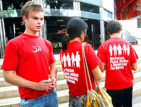Most carried candles and wore red T-shirts with the slogan "We pursue peace, justice and democracy for Burma."