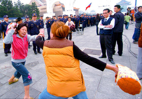 Emotions continued to run high at the National Taiwan Democracy Memorial Hall yesterday as protesters and supporters traded angry volleys while work on changing the inscription on the hall's entry arch proceeded. The original four Chinese characters, dazhong zhizheng (