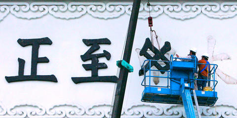 "All workers and police officers who assist in destroying the inscription face a minimum of five years' imprisonment for vandalizing a historic site. Stop your work at once. You are being used by your superior," Yeh Ching-yuan (葉慶元), commissioner of the city government's Law and Regulation Committee, said repeatedly through a portable speaker while watching the crane ascend up to the arch.