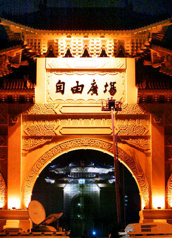 The new inscription on the National Taiwan Democracy Hall's main arch made its debut last night when the final bolt was hammered in at 6:03pm to install the Chinese characters ZIYOU GUANGCHANG (