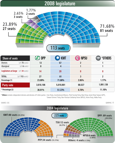 The other parties -- including the Taiwan Solidarity Union (TSU) and the New Party -- faired poorly, with none of them reaching the 5 percent threshold required to win legislator-at-large seats.