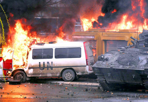 The police and troops responded with tear gas. Some UN vans with detainees were still in the courtyard of the compound, with dozens of Serb protesters outside blocking their exit.