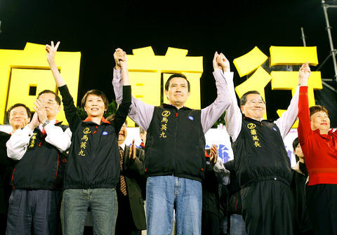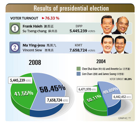 Chinese Nationalist Party (KMT) candidate Ma Ying-jeou (馬英九) and his running mate Vincent Siew(蕭萬長)scored an overwhelming victory in yesterday's fourth direct election for president, taking nearly 60 percent of the vote to defeat Democratic Progressive Party (DPP) candidate Frank Hsieh(謝長廷) and his vice presidential candidate Su Tseng-chang(蘇貞昌).