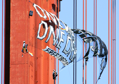 The protests continued on Monday with a dramatic stunt at San Francisco’s Golden Gate Bridge, two days before the torch’s arrival to the city. Police appeared to have been caught cold by the protest, during which demonstrators scooted up the bridge’s cables using climbing gear and unfurled two giant banners.