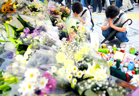 Yesterday, the crime scene was covered with offerings of flowers, comic books and soft drinks left for the souls of the dead. The offerings were shielded from the rain by a small white tent.