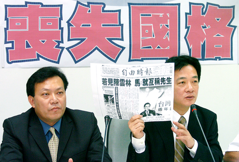 The DPP lawmakers, led by caucus whip William Lai (賴清德), told a press conference that they could not accept Ma’s view of the title he should use in talks with Chen.