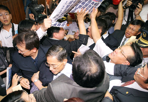 Legislators engaged in physical and verbal clashes during the legislature’s Diplomacy and National Defense Committee meeting yesterday as Democratic Progressive Party (DPP) legislators continued their criticism of Minister of Foreign Affairs Francisco Ou (歐鴻鍊).