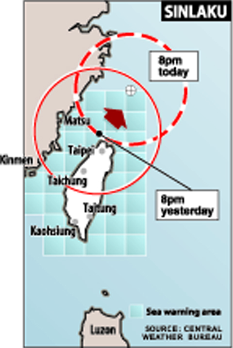 At 7pm, the center of Sinlaku was 40km northwest of Keelung. It was moving northeast at a speed of 7kph with a radius of 250km.