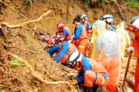 In Miaoli County, rescuers dug out the bodies of a married couple buried alive by a mudslide. The couple’s family said the couple had insisted on staying in the area.