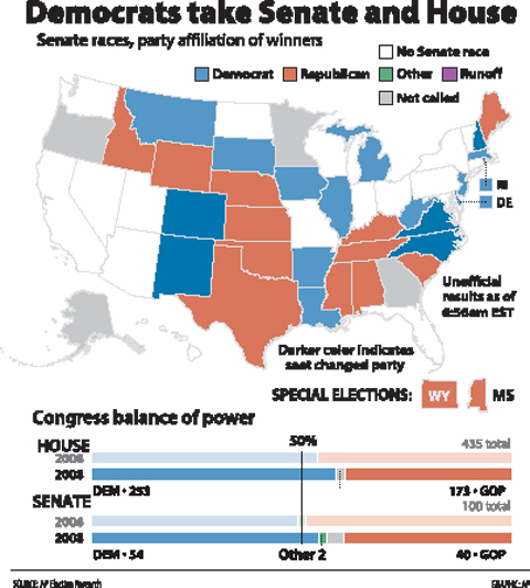 The Democratic winners included Obama’s running mate Joe Biden of Delaware, who was elected to his seventh senate term on Tuesday but must give up his seat now that he will become vice president. The state’s governor will likely appoint a fellow Democrat to fill Biden’s seat until 2010 when a new election will be held.