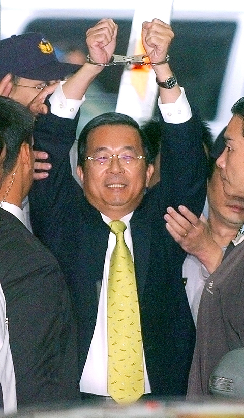 A handcuffed former president Chen Shui-bian (陳水扁) was taken to the Taipei District Court in police custody yesterday as prosecutors sought his detention in connection with alleged embezzlement from the presidential “state affairs” fund and claims of money laundering by the former first family.