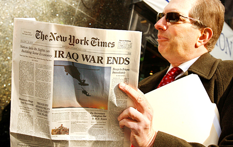 A group of pranksters handed out more than 1.2 million fake New York Times newspapers mainly in New York City and Los Angeles on Wednesday with a front page story declaring “Iraq War Ends” and another on the indictment of US President George W. Bush on treason charges