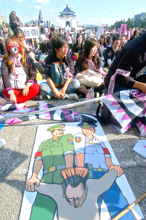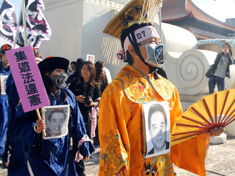 An estimated 4,000 people joined the protest, event organizers said. Students wore Qing dynasty emperor’s and officials’ costumes with pictures of President Ma Ying-jeou (馬英九), Premier Liu Chao-shiuan (劉兆玄), NPA Director-General Wang Cho-chiun (王卓鈞) and National Security Bureau Director-General Tsai Chao-ming (蔡朝明).