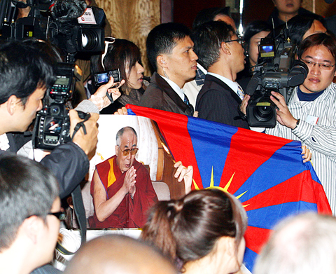 Not long after Ma began his speech, Yang held up a Tibetan flag, while Tsai displayed a photo of the Dalai Lama.