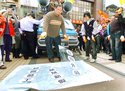 Labor associations from all over Taiwan participated in the protest, including the National Federation of Independent Trade Unions (NAFITU), Tainan County’s Federation of Trade Unions, the Confederation of Taipei Trade Unions and the Youth Labor Unions, shouting slogans and holding placards reading: “Stop unpaid leave,” “Government, help businesses, Workers are losing their jobs,” “Help workers, stop unemployment,” “Bail-out fund should put workers first” and “Protect nationals, stop using foreign labor.”
