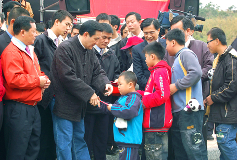 More than 1,000 people crammed into Ma Village (馬家庄) in Miaoli County’s Tongsiao Township (通宵) yesterday, hoping to receive a lucky red envelope from President Ma Ying-jeou (馬英九), but the manner in which the eager crowd was ushered past the president caused some displeasure among those who had waited several hours to meet him.