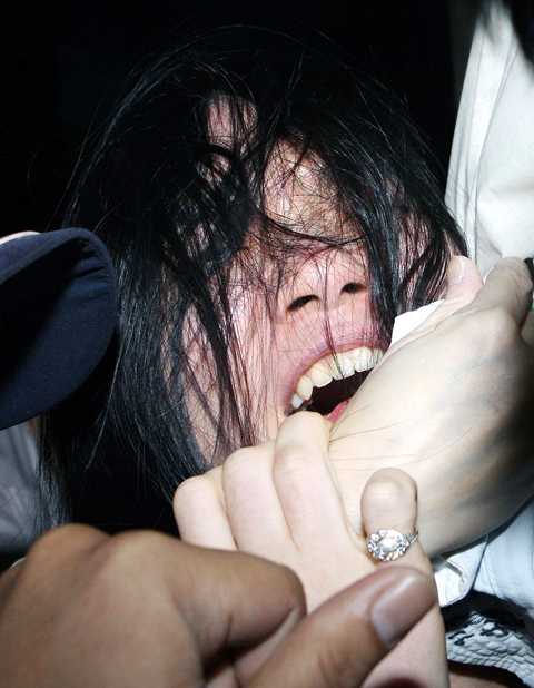 As people crowded around her, Chen Hsing-yu yelled out in pain when an umbrella accidentally hit her in the face.