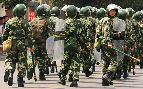 Columns of paramilitary police in green camouflage uniforms and flak vests marched around Urumqi’s main bazaar — a largely Uighur neighborhood — carrying batons, long bamboo poles and slingshots yesterday. The mobile phone service was blocked and Internet links were also cut or slowed down.