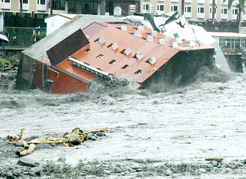 In eastern Taiwan, the Jinshuai Hotel in Jhihben (知本), Taitung County, collapsed into the Jhihben River just before noon after its foundations were eroded by surging floodwaters.