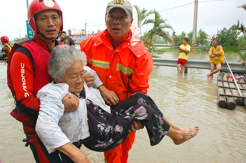 The disaster emergency center said a 78-year-old man was found dead at his home in Hsinhua Township (新化), Tainan County, and a 63-year-old disabled man in Pingtung County’s Kaoshu Township (高樹) drowned after becoming trapped in his home.