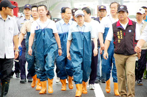 Premier Liu Chao-shiuan (劉兆玄) traveled to the Linbian Interchange, Pingtung and Kaohsiung counties to inspect flooded areas.