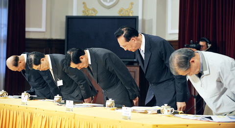 Leading Vice President Vincent Siew (蕭萬長), Minister of National Defense Chen Chao-ming (陳肇敏), Vice Premier Paul Chiu (邱正雄) and Central Emergency Operations Center Commander Mao Chi-kuo (毛治國) in a deep bow — a symbolic apology — Ma said that as the leader of the country he would take full responsibility for all the mistakes made during the disaster and that he wanted to offer his most sincere apology to the public, especially those who lost loved ones.