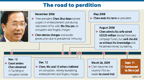 The Taipei District Court yesterday sentenced former president Chen Shui-bian (陳水扁) and his wife to life in prison after handing down a guilty verdict in the graft trial against the former first couple and 11 co-defendants.