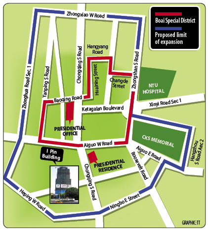 Chinese Nationalist Party (KMT) Taipei City Councilor Chen Cheng-chong (陳政忠) joined Huang in urging the city government not to sacrifice the rights of Taipei residents and said the Presidential Office should not expand Boai District to protect certain individuals.