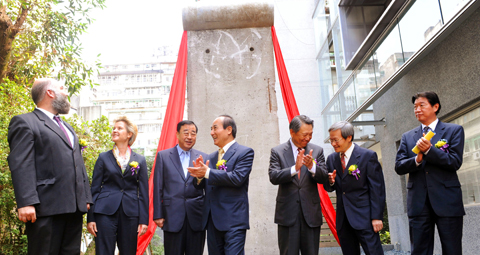 A segment of the Berlin Wall was erected in the garden of the Taiwan Foundation for Democracy (TFD) in Taipei yesterday to mark the 20th anniversary of the fall of the wall, but the foundation declined to draw parallels with Taiwan.