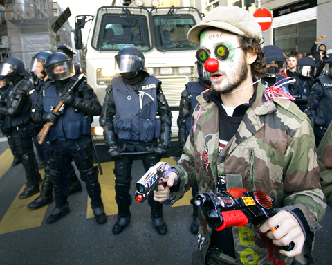 The clashes occurred during a march by demonstrators protesting a meeting of the WTO scheduled to start today, in which the US, China and other powers will spearhead a new attempt to find ways to revive world trade and drag the global economy out of recession.