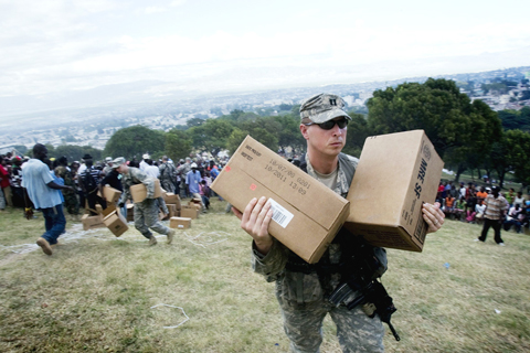 A journalist saw one US helicopter dropping a half-dozen small cartons into a stadium of starving Haitians, some brandishing machetes as they fought over the items.