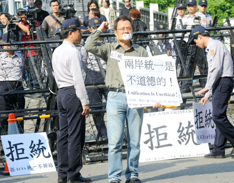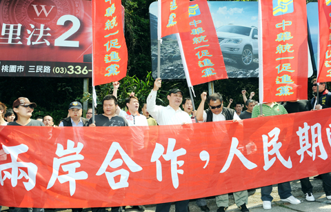 Outside the talk’s venue yesterday morning, the China Unification Promotion Party (CUPP) mobilized about 30 members to voice their support for the trade pact.