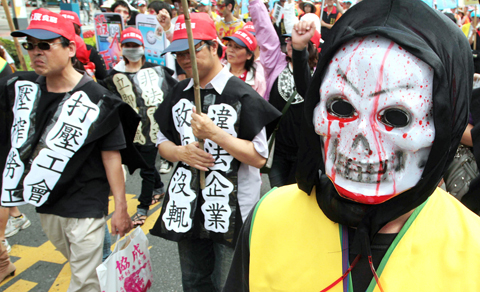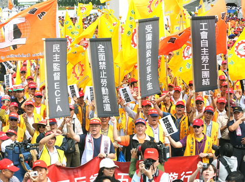 More than 10,000 workers from across the country marched on the streets of Taipei to voice their anger at the increasing trend of temporary hiring and the exclusion of labor issues in talks for an economic cooperation framework agreement (ECFA) the government plans to sign with China.