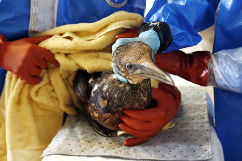 The first known wildlife casualty of the massive oil spill threatening the US Gulf Coast was a single Northern Gannet seabird, found alive, but coated in the toxic grime creeping ashore along Louisiana’s coast.