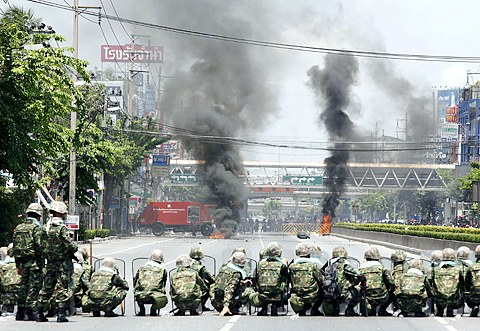 Thai troops fired bullets and tear gas at anti-government protesters rioting near the US and Japanese embassies yesterday as an army push to clear the streets sparked clashes that have killed two and turned central Bangkok into a virtual war zone.