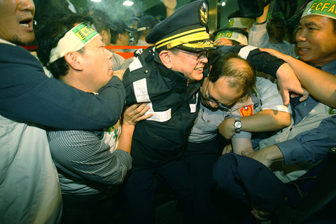 During the committee meeting at the Joint Central Government Officers Tower in Taipei, DPP lawmakers tried to break into the venue by climbing over the fence and metal gates surrounding the building. Police officers rushed to stop the lawmakers, triggering scuffles and clashes.