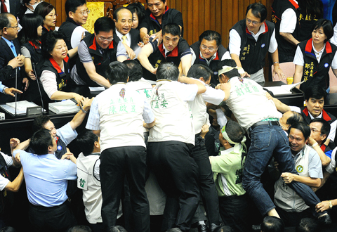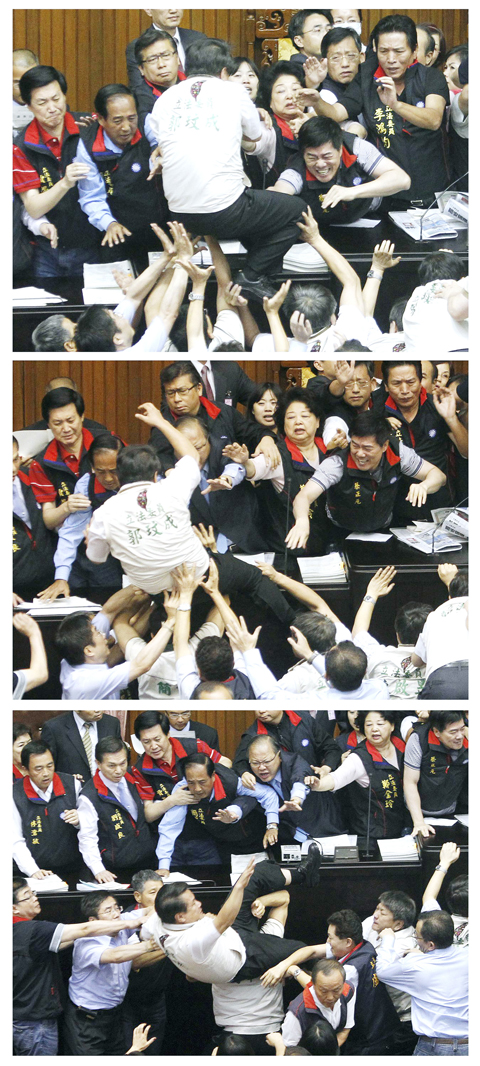 During the scuffle, Legislative Speaker Wang Jin-pyng (王金平), heavily guarded by Chinese Nationalist Party (KMT) legislators on the speaker’s podium, announced that the Legislative Yuan had approved the KMT caucus’ proposal to allow the ECFA and a cross-strait copyright protection agreement to skip preliminary review.