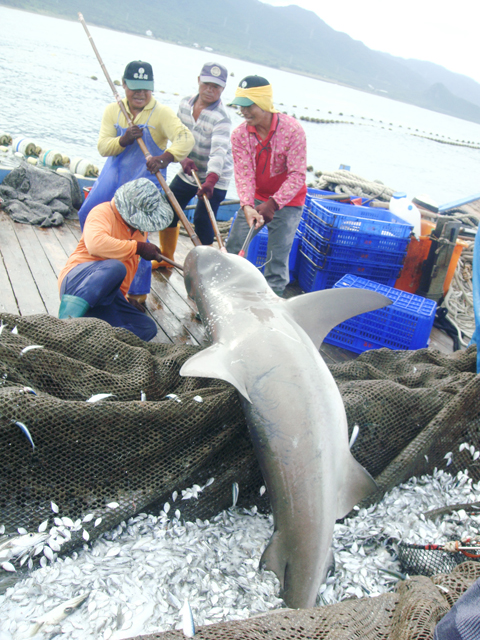 A fisherman nicknamed “A Fong” (阿風) said he first saw a bull shark last month after he had become trapped in one of his underwater nets. The 167kg-shark was found dead in the net.