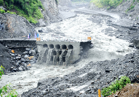 The DGH closed the temporary Shuangyuan Bridge on Highway No. 17 and the Sinfa Bridge on Highway No. 27. It said three sections of Highway No. 27 were damaged, which affects traffic between villages in Kaohsiung County’s Liouguei (六龜) Township.