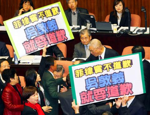 Democratic Progressive Party legislators shot back at Wu, accusing the government of agreeing to hold the meeting between Ma and Roxas despite Manila’s refusal to apologize.