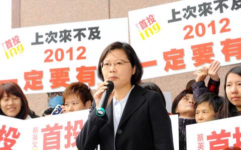 At her registration yesterday, Tsai brought about 40 university students holding signs saying: “My first vote for Tsai Ing-wen.”