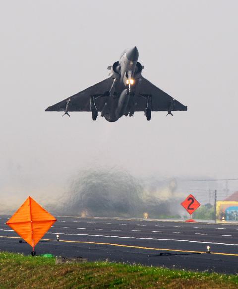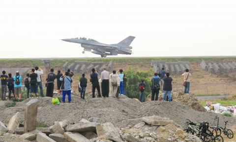 In the exercise, which began at 7:26am in heavy fog, two Indigenous Defense Fighters (IDF), two F-16A/Bs and two Mirage 2000s landed on a 2.7km stretch of Freeway No. 1 in the Madou area of Greater Tainan. More than 1,300 members of the armed services participated in the exercise.
