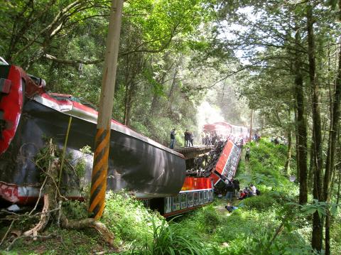 The Council of Agriculture (COA) said the accident occurred at 12:17pm when a large tree next to the tracks fell and hit the last car of the train. Four of the train’s cars were derailed, with two tumbling down the embankment.