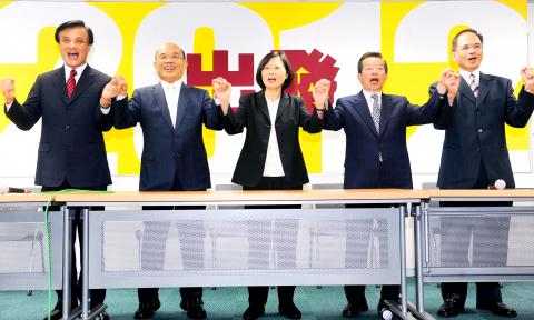 Democratic Progressive Party (DPP) Chairperson and presidential candidate Tsai Ing-wen (蔡英文) joined hands with party heavyweights yesterday in a show of unity amid recognition that next year’s election would be difficult to win.